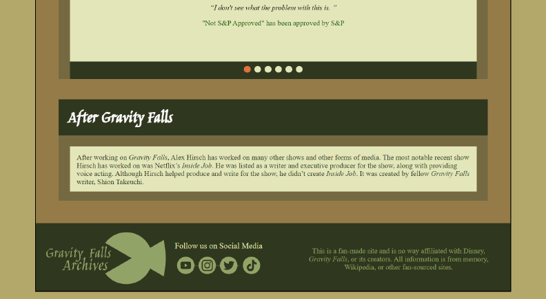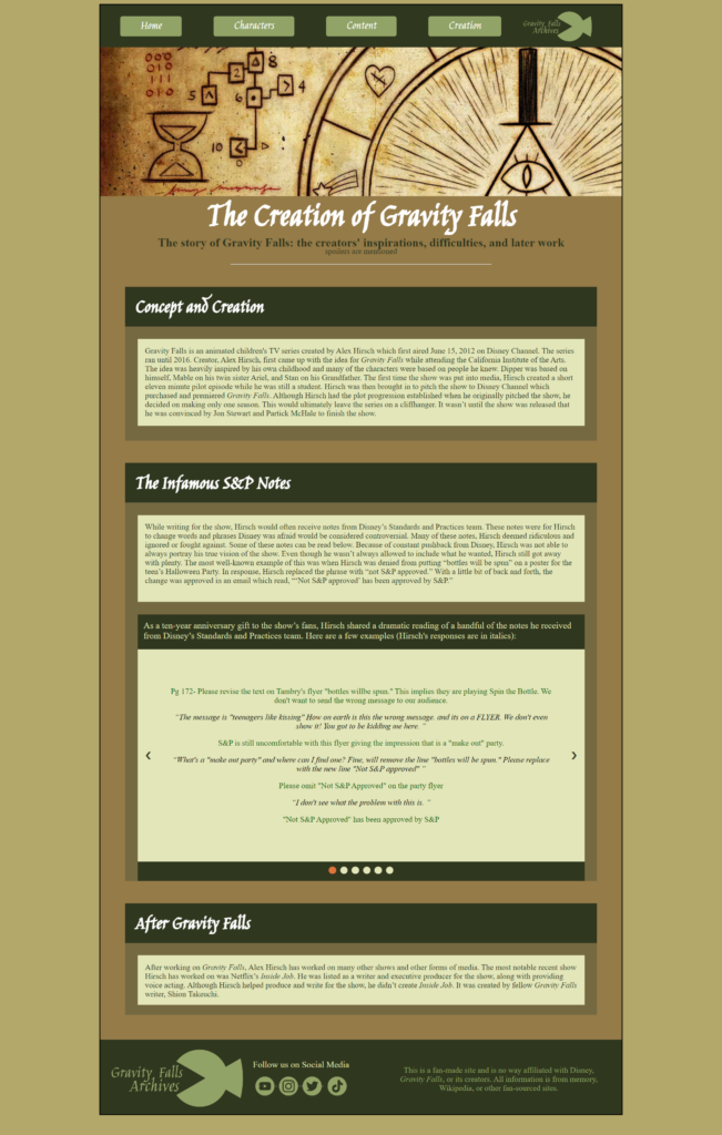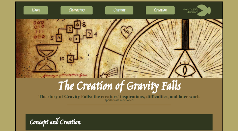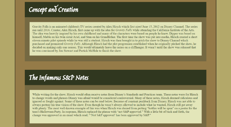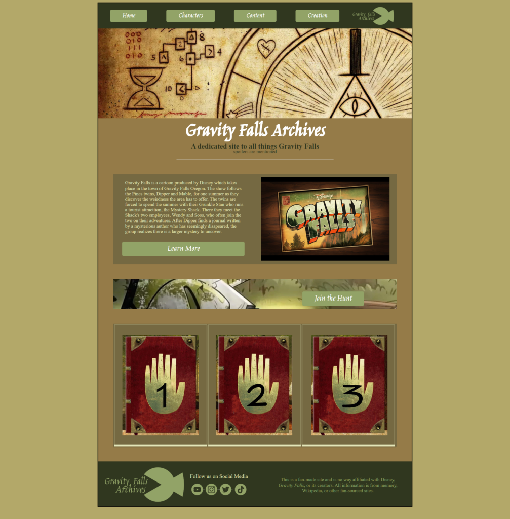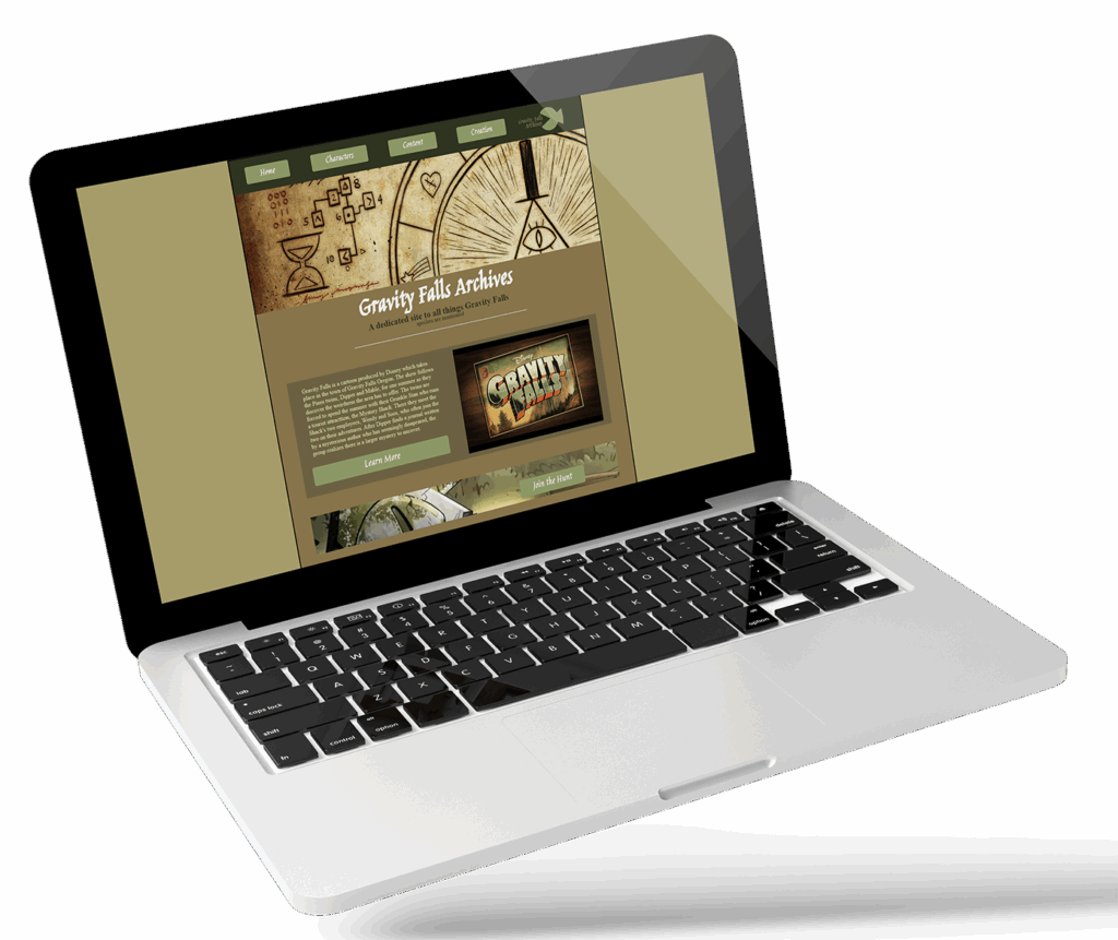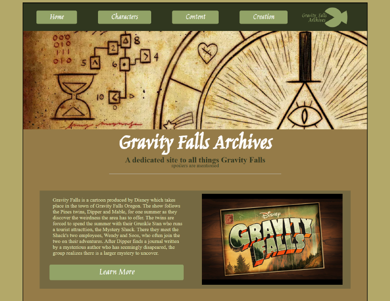 Built entirely with HTML, CSS, and JavaScript, The Gravity Falls Archives is a fan-made website intended to document interesting information about the popular Disney Show, Gravity Falls.