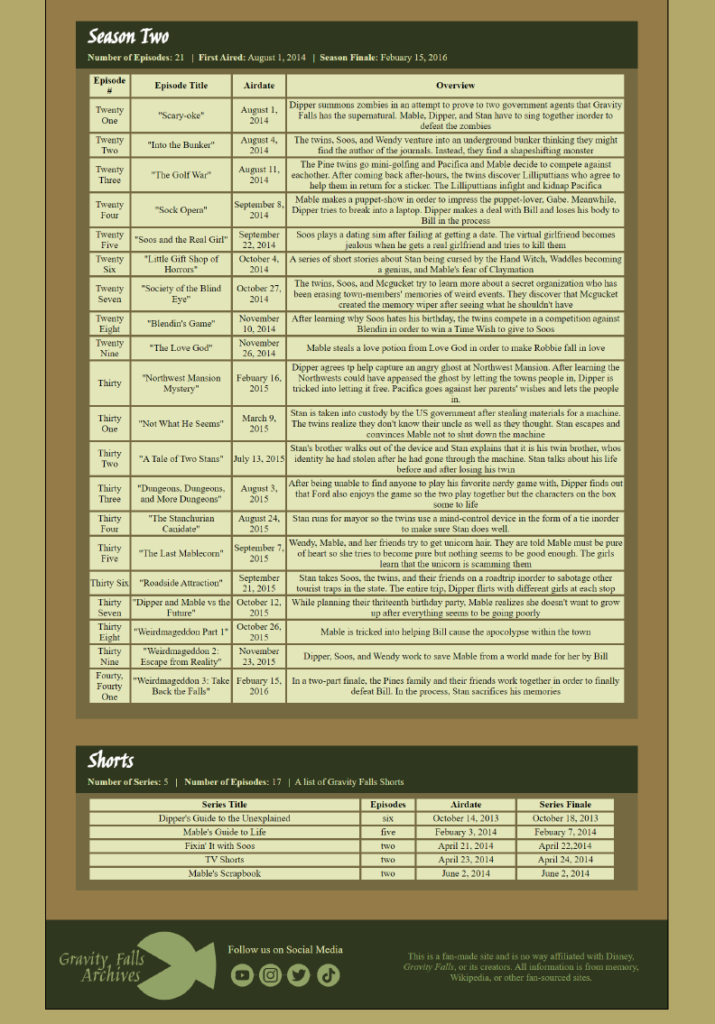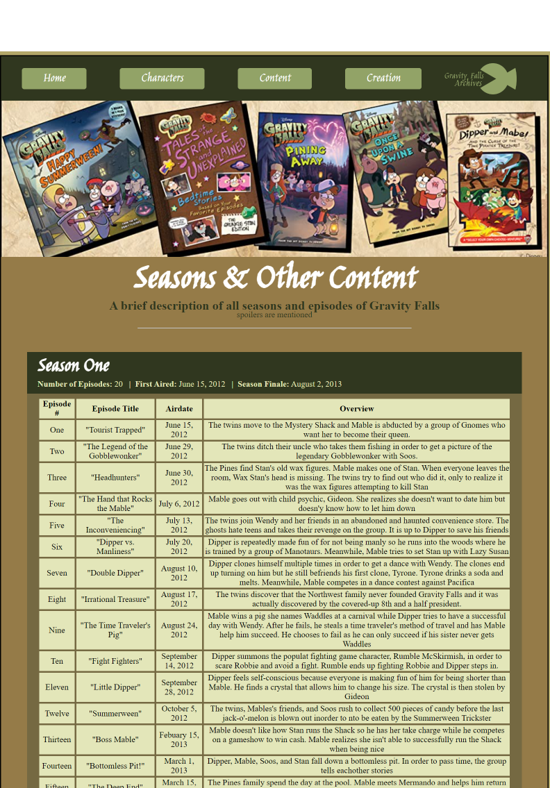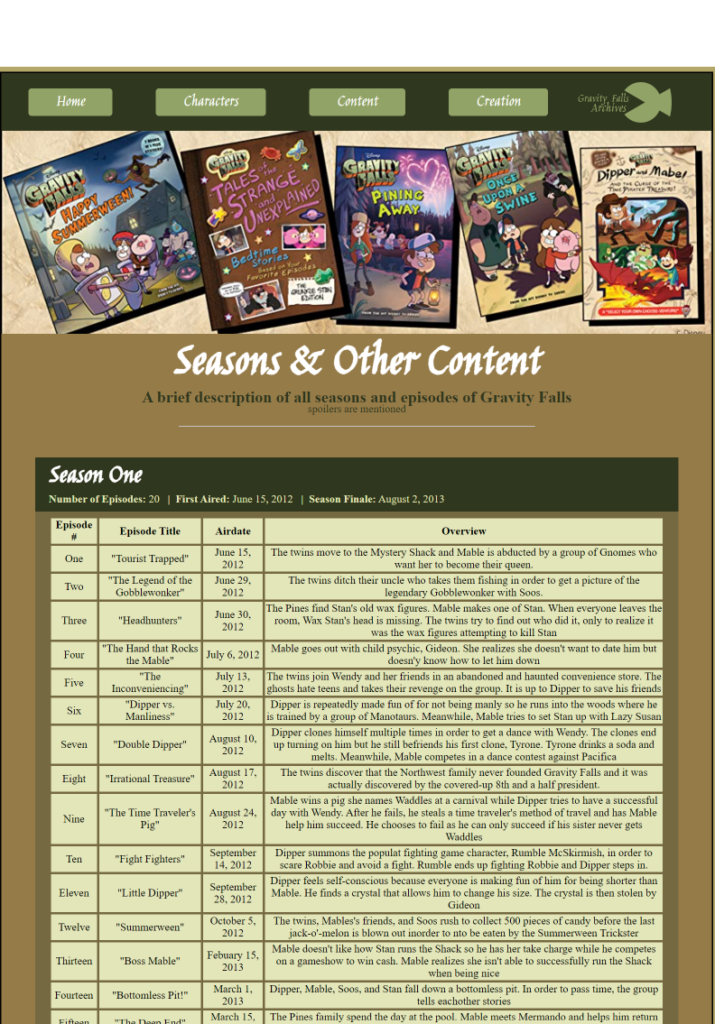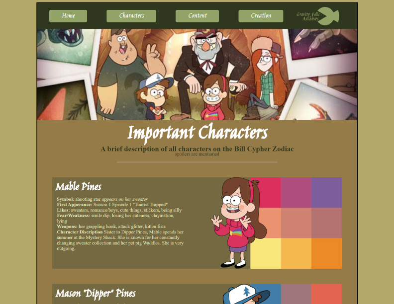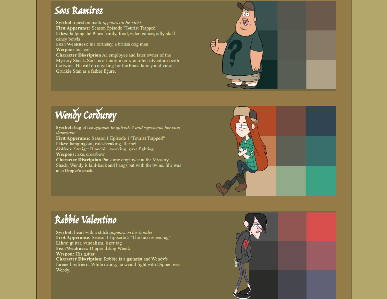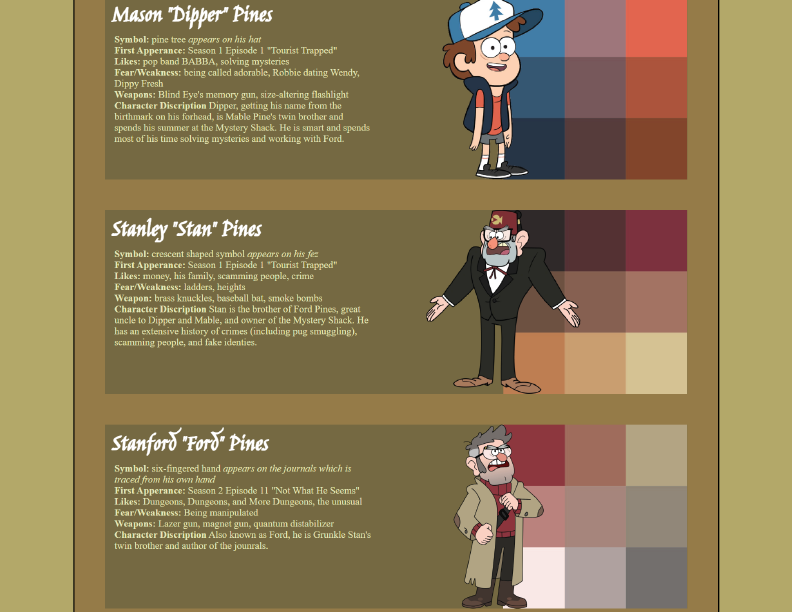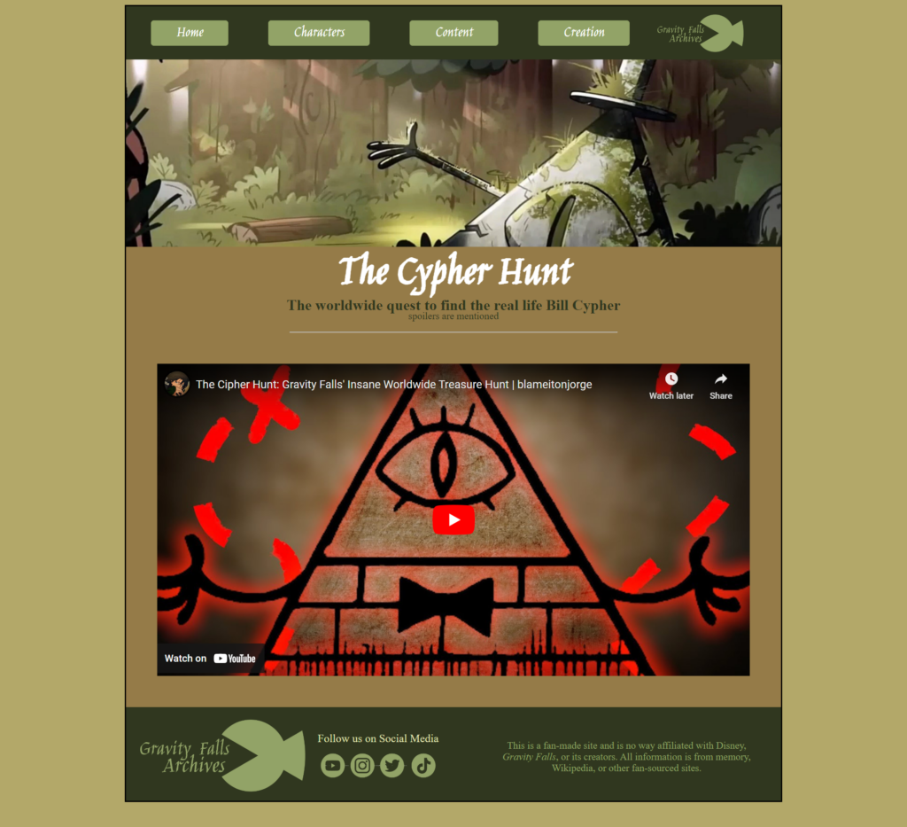 Built entirely with HTML, CSS, and JavaScript, The Gravity Falls Archives is a fan-made website intended to document interesting information about the popular Disney Show, Gravity Falls.